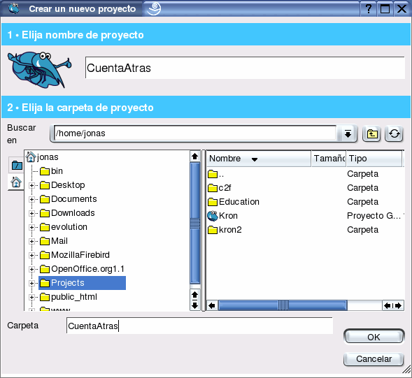 Elegimos Nuevo Proyecto. En la siguiente ventana, en el Paso 1 nos pide Nombre del Proyecto. Nuestro proyecto se llamará CuentaAtras. En el Paso 2 debemos elegir la Carpeta del Proyecto. Seleccionamos nuestro directorio de trabajo, y en la caja de edición de la parte inferior, escribimos el nombre de la carpeta que vamos a crear.