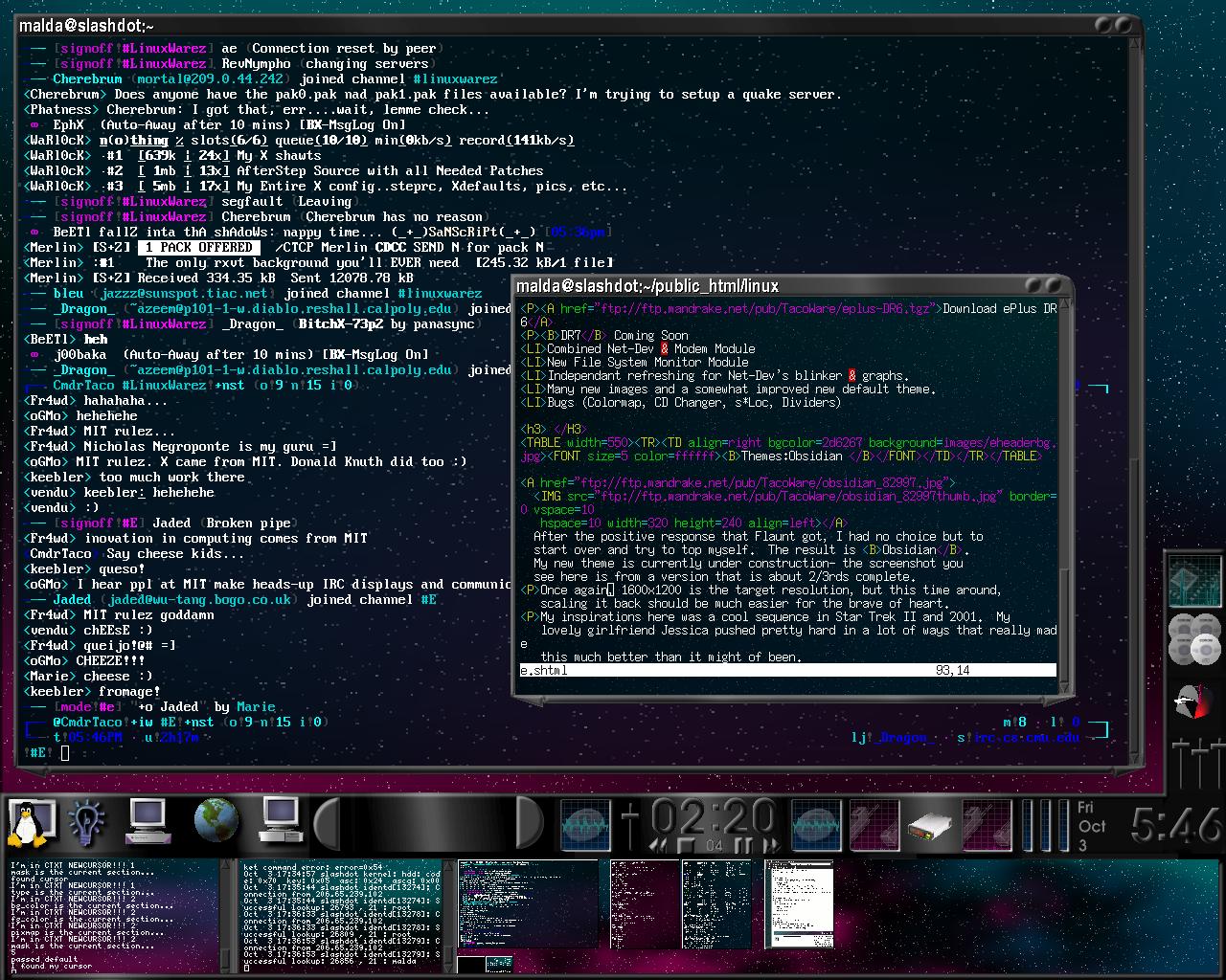 Enlightenment 是一個很花俏的視窗管理員, Enlightenment 的作者們提供了一個高度可自行設定的環境, 允許使用者設定視窗外觀的每個部份, Enlightenment 在電腦運算之餘, 增添了許多樂趣, 我們再也不用面對那些四四方方, 到處看起來都一樣的死板視窗囉! 您只要載入預設的 "主題" (theme), 就足以使親朋好友們對您的桌面妒羨不已, 要讓大家嚇一跳的話, 就去抓 Aliens Neuromancer 來用吧; 可供選用的主題, 大約有二十來個, 這只是裡面的兩個而已, 您可以在 Enlightenment 的網站 http://www.enlightenment.org/themes 抓到這些人家做好的主題。